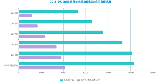 截至上述四個年度末期,綠地預(yù)收款分別為1688.05億元、2374.24億元、3382.3億元、3811.46億元,占總負(fù)債26%、31%、36%、38%;到2020年前三季,綠地預(yù)收款和合同負(fù)債合計為4126.51億元,占總負(fù)債比重達(dá)到40%。