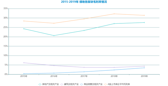 2015-2019年,綠地房地產(chǎn)行業(yè)毛利率在20%以上,但基建和消費(fèi)板塊的毛利率情況不盡如人意。