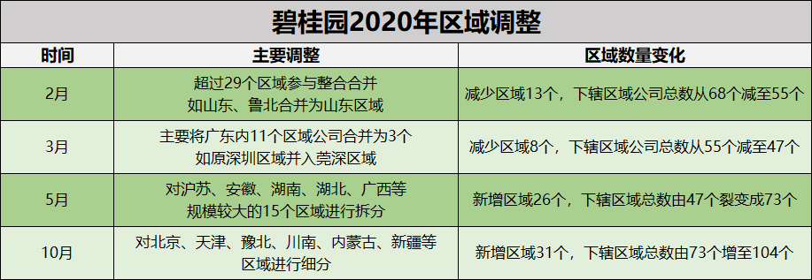 自年初伊始,整個(gè)房地產(chǎn)行業(yè)還未從疫情的沖擊中緩過(guò)神來(lái),碧桂園已率先作出改變。經(jīng)過(guò)貫穿一整年的大刀闊斧調(diào)整之后,下轄區(qū)域擴(kuò)張至104個(gè)。