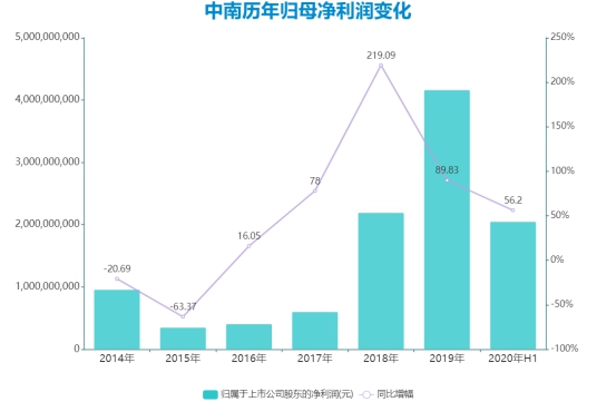 大手筆推動下,中南近兩年發(fā)展增速頗為可觀。按其預期,2020年度歸母凈利潤將達到60億元-80億元,最高同比增幅達到了92.17%。