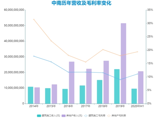 數(shù)據(jù)顯示,2016年-2019年以及2020年上半年里,中南建設地產(chǎn)業(yè)務分別錄得毛利率18.08%、15.57%、20.23%、17.93%、19.4%;該水平遠低于以證監(jiān)會標準統(tǒng)計的A股上市地產(chǎn)公司毛利率平均值。
