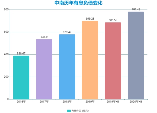 從長遠看,中南或許能夠將自己的負債結構優(yōu)化到位。截至2020年6月,有息負債約為781.4億元,這一絕對值在同規(guī)模公司中并不算高,短期借款和一年內到期的非流動負債為237億元,占比30.33%。