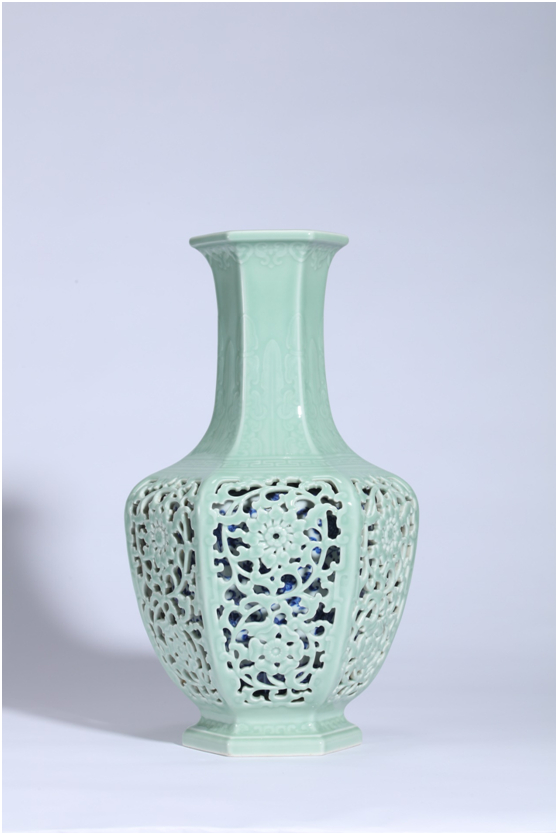 世茂海絲館藏品-外粉青鏤空纏枝花卉紋內(nèi)青花六方套瓶