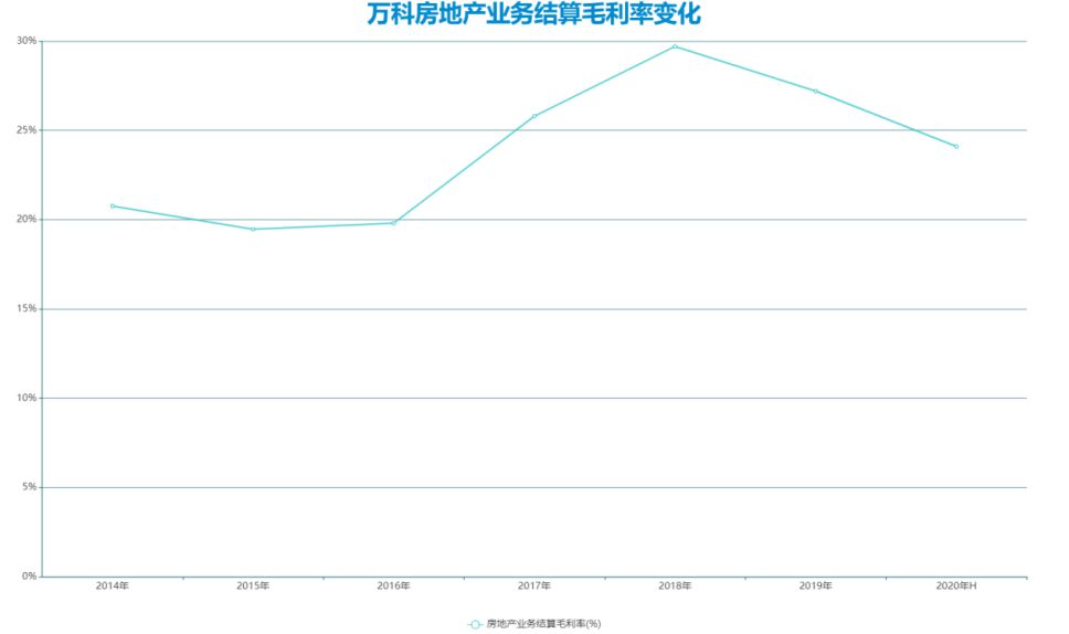 這背后也隱藏一個(gè)事實(shí),盈利水平下降已經(jīng)成為房企面臨的挑戰(zhàn)之一。從數(shù)據(jù)來看,萬(wàn)科房地產(chǎn)業(yè)務(wù)結(jié)算毛利率自2018年起持續(xù)下滑,至2020年中期為24.1%。
