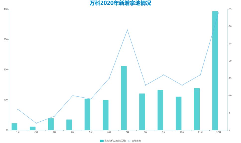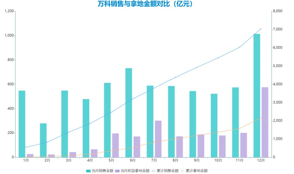 下半年,隨著土地市場(chǎng)熱度下行,萬(wàn)科投資步伐加快,拿地速度有了質(zhì)的變化。據(jù)觀點(diǎn)新媒體統(tǒng)計(jì),6-12月萬(wàn)科每月平均新增20.17宗地,其中僅7月及12月便累計(jì)新增63宗;12月新增34宗地,對(duì)應(yīng)拿地總額576.9億元,占同期銷售比例高達(dá)57%。