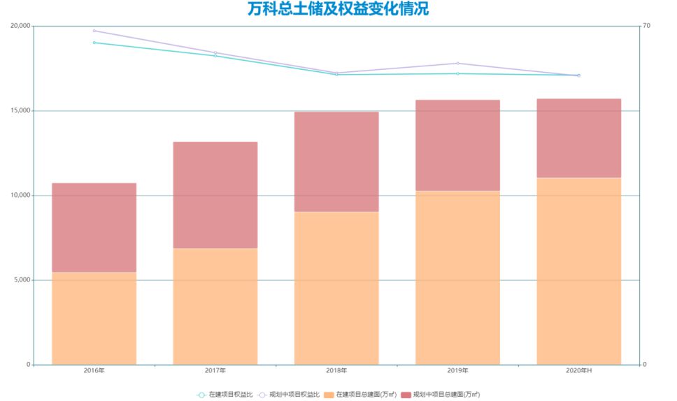 數(shù)據(jù)顯示,2016-2019年及2020年上半年,萬(wàn)科在建及規(guī)劃中的土地儲(chǔ)備逐步增加,其中權(quán)益土儲(chǔ)占比在逐步下降,近年維持在60%上下。而2020年上半年新增土地投資降低的同時(shí),權(quán)益比例也降至51.48%,至下半年有意提高,全年新增土儲(chǔ)權(quán)益升至67%,與2019年齊平。