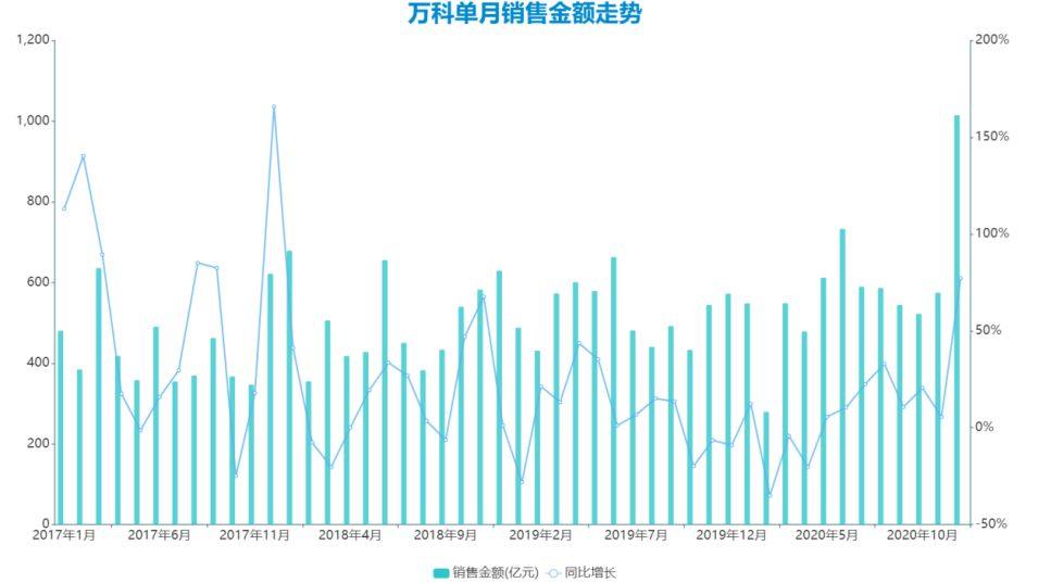 從單月銷售看,2020年上半年萬(wàn)科憑借積極銷售,以及加快線上營(yíng)銷渠道的運(yùn)用,至5月份便恢復(fù)同比正增長(zhǎng)。下半年月銷售額維持在五六百億,而12月單月實(shí)現(xiàn)1015.4億元,同比增長(zhǎng)77.18%,創(chuàng)下該公司歷史紀(jì)錄。