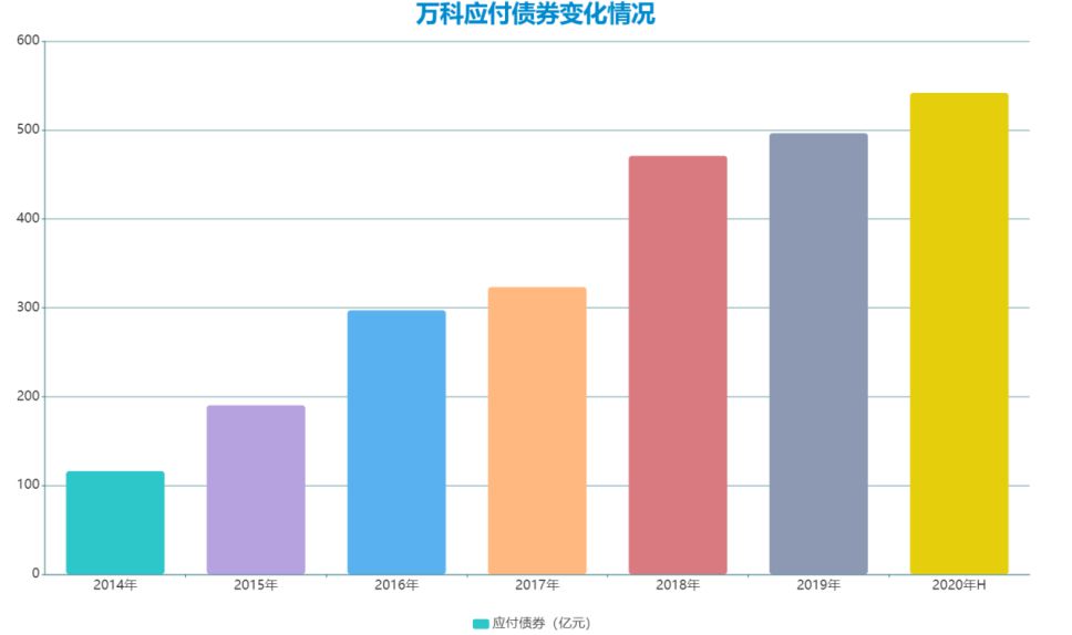 2020年6月,萬(wàn)科以每股25港元配售3.156億股H股,通過股權(quán)融資渠道成功募資78.9億港元;中期應(yīng)付債券達(dá)541.85億元,較2019年底增加9.1%,而至三季度末下降為498.4億元,主要由于償還債券所致。