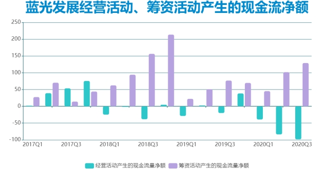 2020年前三季度,藍(lán)光經(jīng)營(yíng)活動(dòng)產(chǎn)生的現(xiàn)金流量?jī)纛~均為凈流出狀態(tài),分別為39.32億元、83.77億元、98.50億元。2019年同期,則為流出28.83億元、流入2.42億元以及流出20.04億元。
