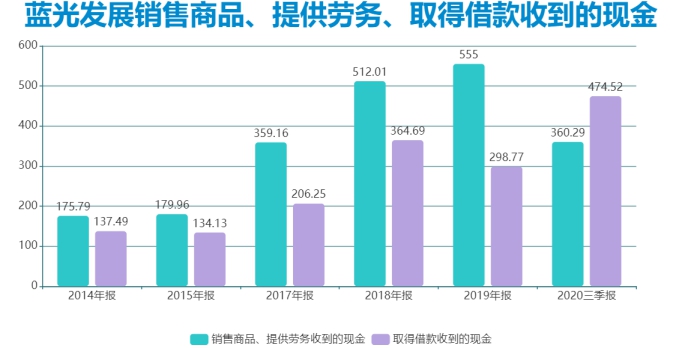 2020年第三季度,藍(lán)光通過(guò)借款收到的現(xiàn)金達(dá)到474.52億元,創(chuàng)下歷史新高,較2019年同期大幅增長(zhǎng)42.62%,凈額增長(zhǎng)141.81億元。