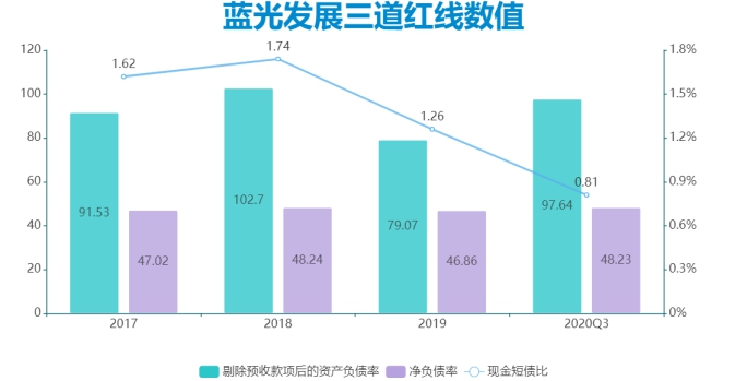 據(jù)了解,2020年三季度,藍(lán)光剔除預(yù)收賬款后資產(chǎn)負(fù)債率為48.23%,凈負(fù)債率為97.64%,現(xiàn)金短債比0.81。值得注意的是,在2019年末,藍(lán)光凈負(fù)債率還是79.07%,最新披露的數(shù)據(jù)按年增長(zhǎng)18.57個(gè)百分點(diǎn)。