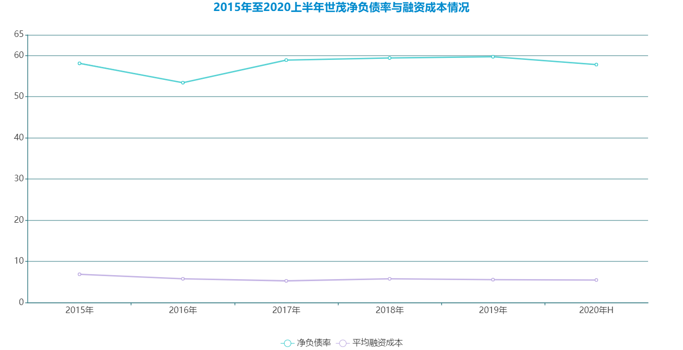 此外,世茂2015至2019年的現金短債比一直大于1。截至2020上半年,總負債為5461億元,有息負債(借貸總額)1429.81億元,凈借貸730.6億元,長短期借貸比例維持在7:3,現金短債比為1.77,目前這一融資結構和負債水平對世茂來說尚屬安全。