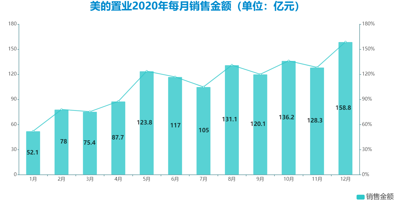 和大部分房企在2020年的表現(xiàn)一致,美的置業(yè)上半年銷售處于全年低位,然后一路上揚,年末達到全年高位水平。