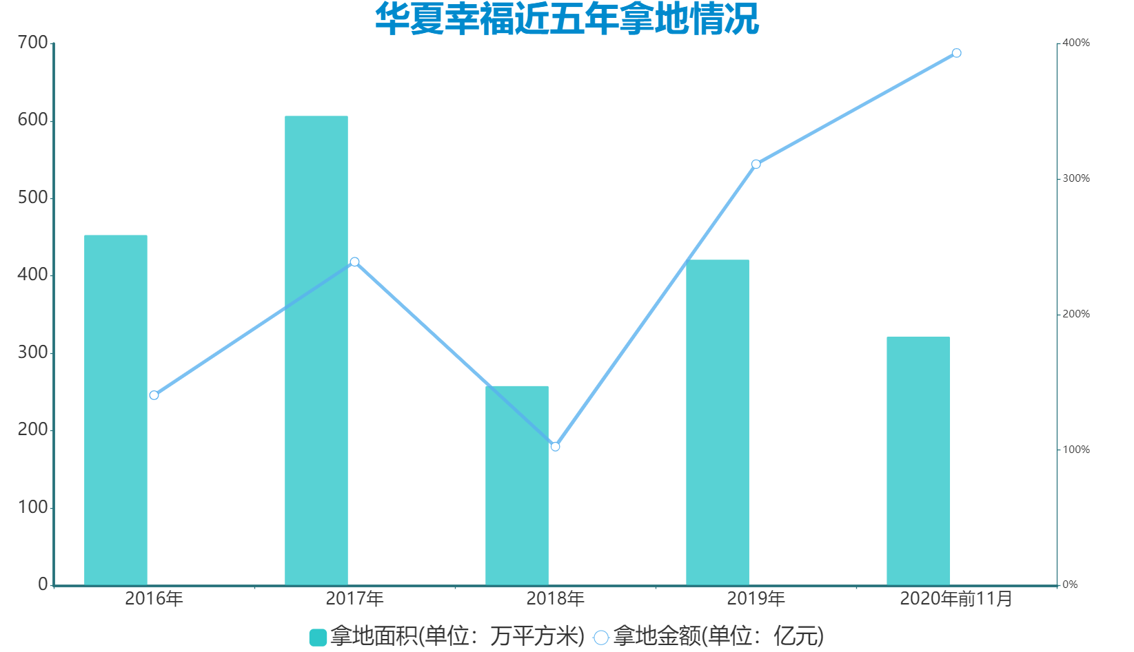 表現(xiàn)在投資端,2020年以來,華夏幸福先后增加拿地額度。截至2020年前11月,這家企業(yè)土地支出達到393.15億元,超過2019年全年拿地金額,新增土地面積321.83萬平方米。