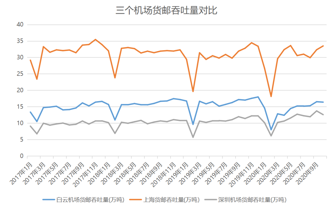 2020年1月至10月,白云機(jī)場(chǎng)的旅客吞吐量約3389.8萬(wàn)人次,貨郵吞吐量則為140.79萬(wàn)噸,疫情防控的常態(tài)化使得白云機(jī)場(chǎng)的客貨流轉(zhuǎn)恢復(fù)相當(dāng)快。