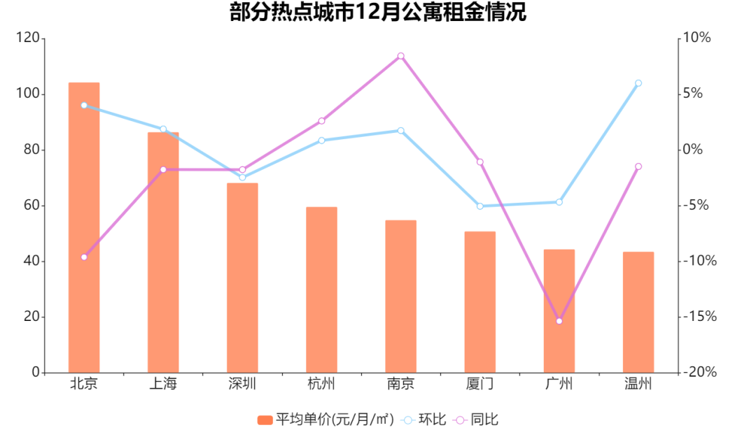 12月,據觀點指數觀察公寓租賃熱門城市數據發(fā)現,8城平均住房租金均價為64.09元/平方米,環(huán)比微升0.29%,同比下跌2.49%。