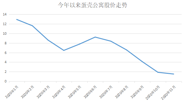 在多個利空沖擊下,蛋殼公寓在二級市場遭到了投資者冷落。2020年6月,股價稍有起色的蛋殼公寓再度遭遇雪崩式下滑,截至2020年10月最后一個交易日,其股價僅1.87美元/股,較上市時下跌超86%。