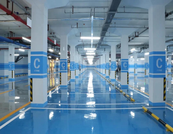 (石家莊榮盛華府車庫實(shí)景圖,使用3MM厚環(huán)氧自流平,鏡面效果更顯品質(zhì)。)