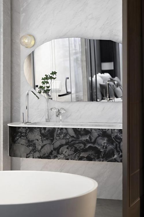 主衛(wèi)以一面清透材質(zhì)的玻璃,形成與主臥邊界的消解。柔和的曲線轉(zhuǎn)合與石材紋理、銀色金屬等材質(zhì)互相呼應(yīng),渲染自由之感,讓情緒輕盈流淌,解放倦意飽和。