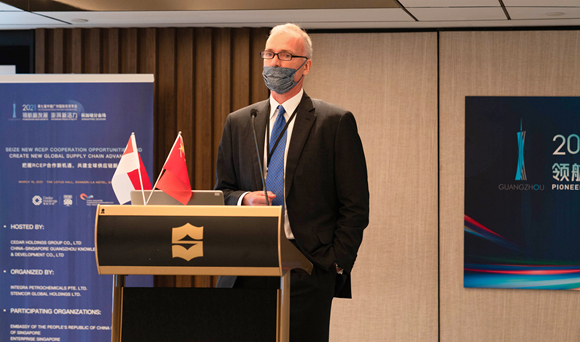 本次分會(huì)場由廣州本土世界500強(qiáng)企業(yè)雪松控股和中新廣州知識城投資開發(fā)有限公司聯(lián)合承辦,以“把握RCEP合作新機(jī)遇,共建全球供應(yīng)鏈新優(yōu)勢”為主題,邀請到了包括中國駐新加坡大使館、新加坡企業(yè)發(fā)展局、交通銀行新加坡分行、荷蘭合作銀行、全球鋼貿(mào)巨頭斯坦科公司、全球知名石化供應(yīng)鏈企業(yè)Integra等機(jī)構(gòu)和企業(yè)代表參會(huì)。