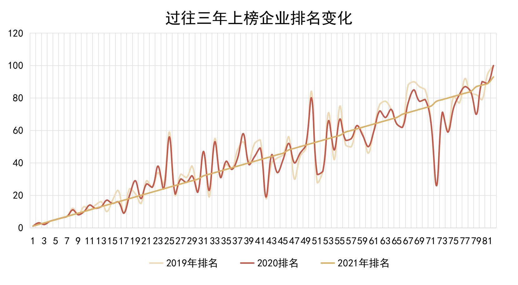觀點(diǎn)指數(shù)整理歷年房企研究名單,三年均入圍的企業(yè)有82家。以2019年的研究成果為基準(zhǔn),可以看到前20房企較為穩(wěn)定,具體體現(xiàn)為2021年中有17家房企是2019年的熟面孔,上升較快的包括中梁控股以及金科股份。