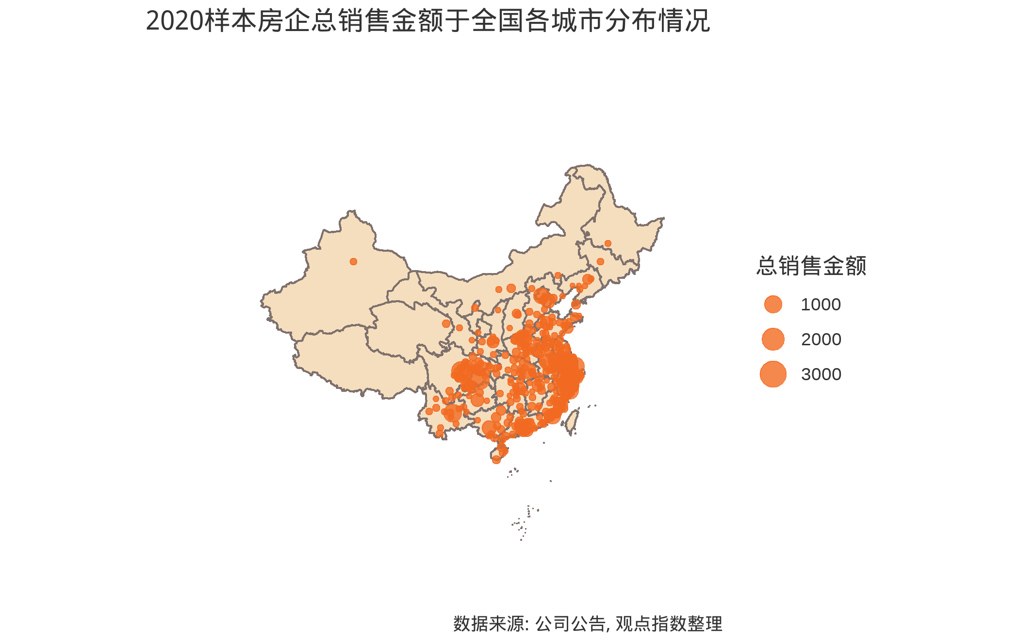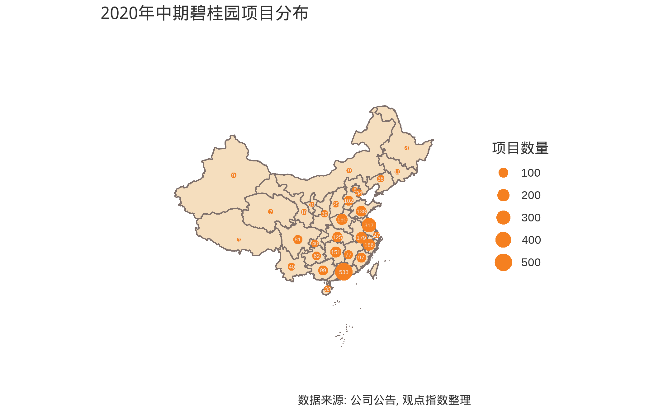 以碧桂園(不在樣本內(nèi))為例,其截至2020年6月30日,已簽約或已摘牌的中國內(nèi)地項(xiàng)目總數(shù)為2662個(gè),分布于31個(gè)省/自治區(qū)/直轄市的288個(gè)地級(jí)市,總計(jì)覆蓋1334個(gè)區(qū)/縣。其中與上述樣本房企銷售貢獻(xiàn)突出的七大城市群高度契合,僅珠三角城市群中的廣東、長三角城市群中的江蘇就分別布局了533和317個(gè)項(xiàng)目。