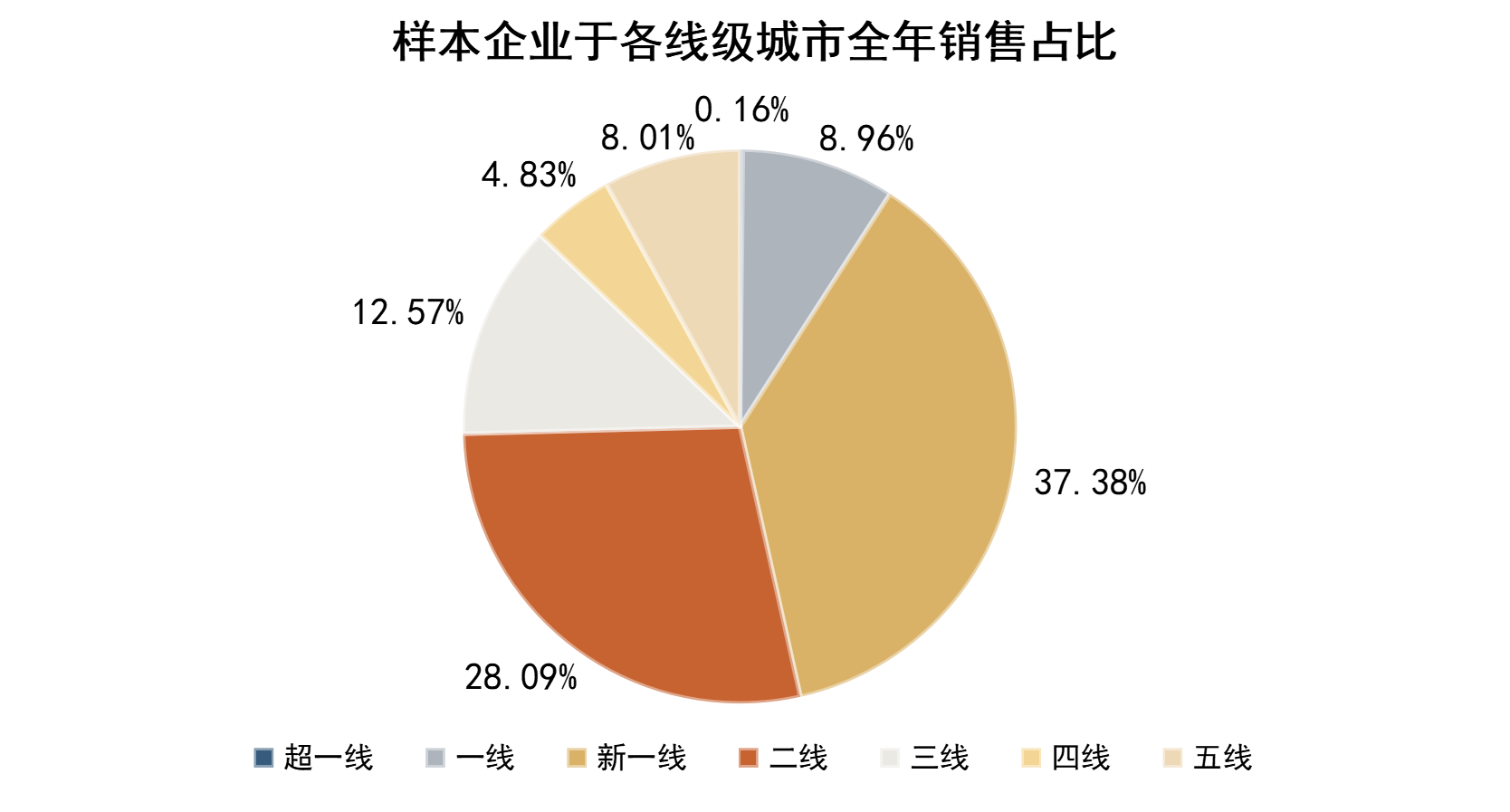 細(xì)分到各線級(jí)城市來看,一線、新一線及二線城市的銷售占比達(dá)到74.43%,其中后兩者占比分別為37.38%和28.09%。而三線、四線和五線城市的銷售占比則分別為12.57%、4.83%和8.01%。