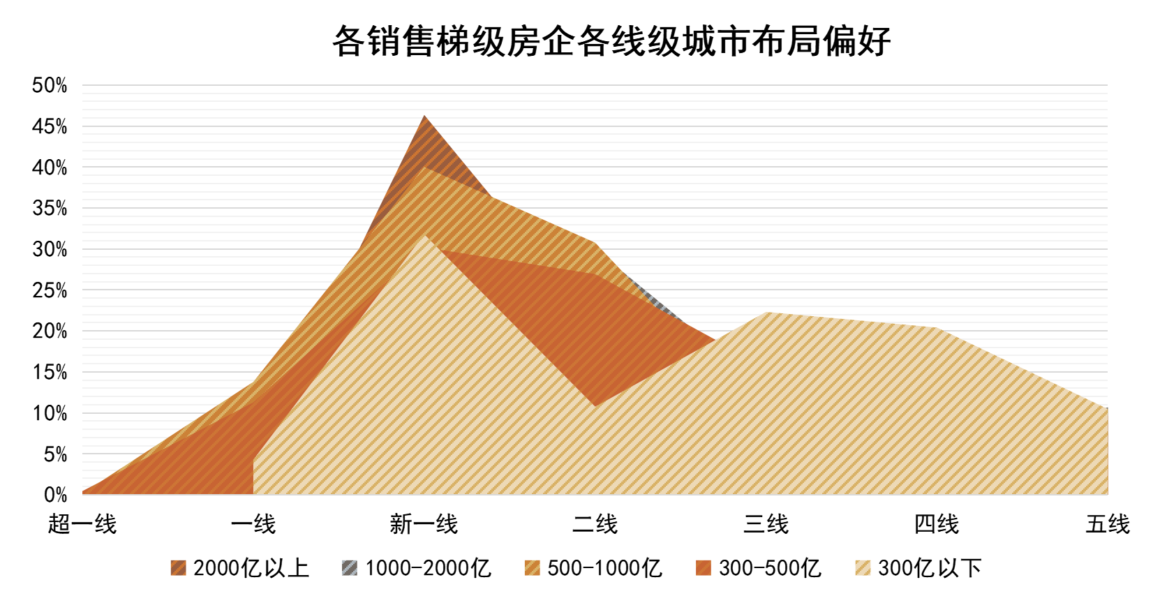 觀點(diǎn)指數(shù)將樣本房企按照銷售規(guī)模分類,觀察不同梯級(jí)的城市布局偏好,可以看到2000億以上、1000-2000億、500-1000億以及300-500億級(jí)別的房企,銷售占比最高的城市均為新一線>二線>三線,僅300億以下房企各城市的銷售貢獻(xiàn)異同,銷售占比最高的城市分別為新一線(31.79%)、三線(22.32%)和四線(20.40%)。