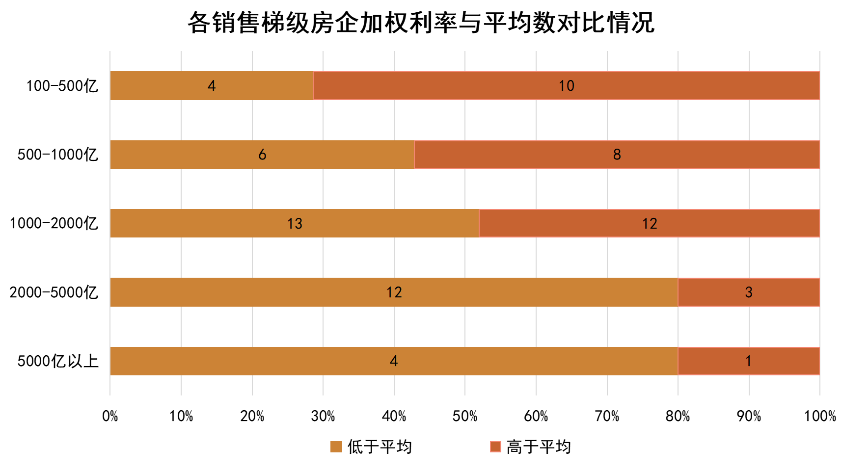 對(duì)比融資成本,上述分化會(huì)更加明顯,觀點(diǎn)指數(shù)將樣本房企按照銷售規(guī)模分類,可以清晰看到銷售規(guī)模在5000億元以上、2000-5000億、1000-2000億的房企,超過50%的加權(quán)平均票面利率均低于平均數(shù),而500-1000億、100-500億房企則相反。雖然發(fā)債利率不完全取決于房企的銷售規(guī)模,還與財(cái)務(wù)健康程度、貨值大小、信用評(píng)級(jí)等息息相關(guān)。但是不可否認(rèn),銷售規(guī)模大的房企,其發(fā)債利率往往更低。