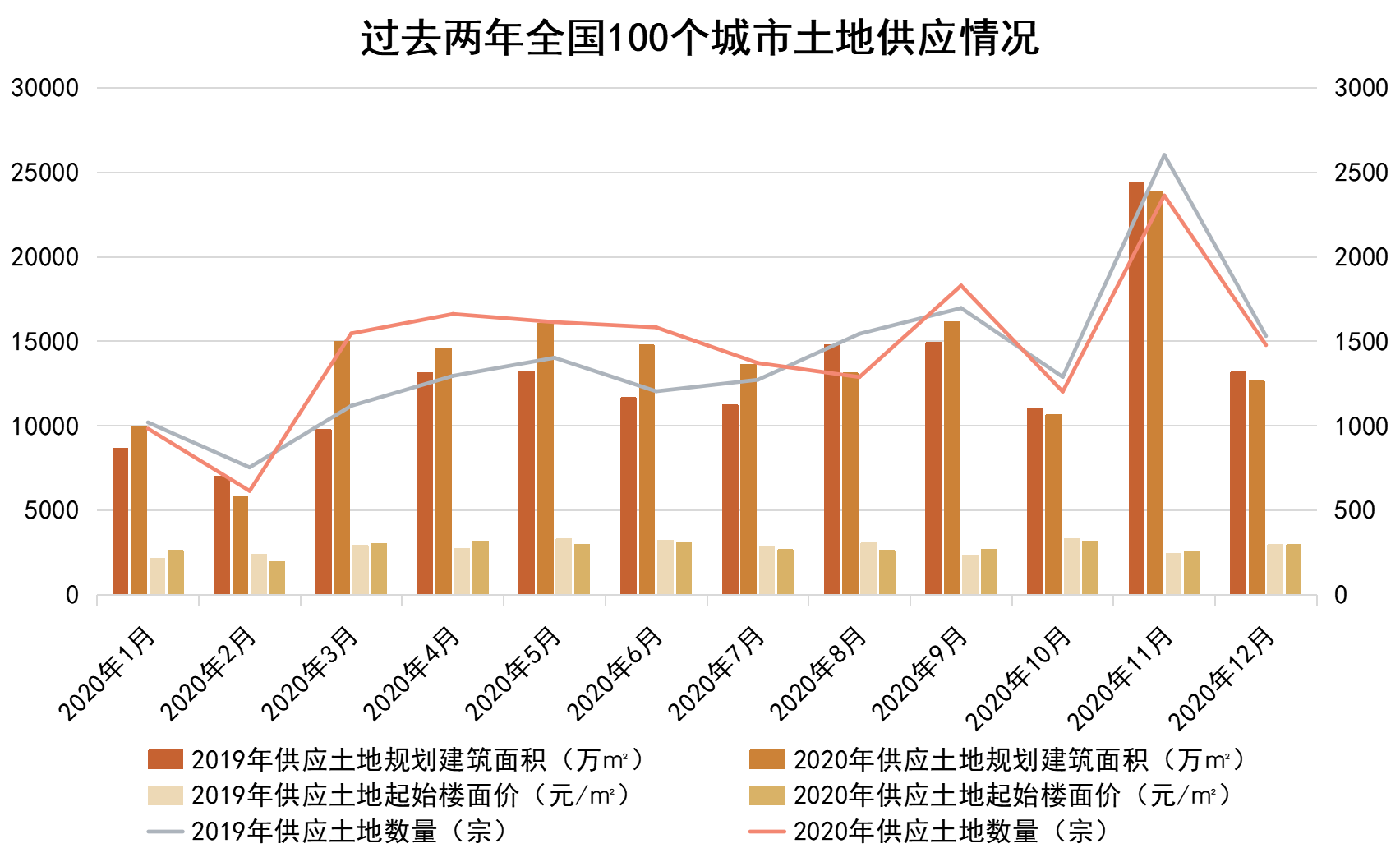 回顧全年,供應(yīng)節(jié)奏上,由于疫情影響,全年土地供應(yīng)呈現(xiàn)前高后低的特點(diǎn)。觀點(diǎn)指數(shù)以全國100個(gè)重點(diǎn)城市作為基準(zhǔn),可以看到2020上半年的土地供應(yīng)數(shù)量為8006宗,高于2019年的6799宗;供應(yīng)土地規(guī)劃建筑面積上,2020年下半年為9億平方米,環(huán)比上半年增長18.23%。