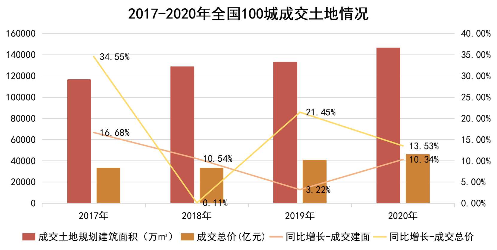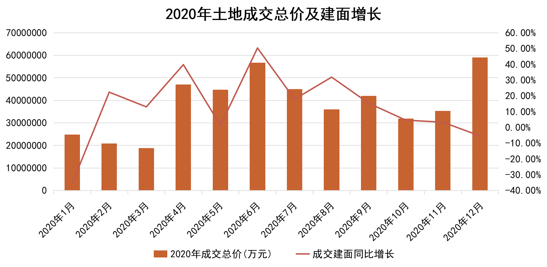 國家統(tǒng)計(jì)局公布的數(shù)據(jù)顯示,2020年,房地產(chǎn)開發(fā)企業(yè)土地購置面積25536萬平方米,相比上年下降1.1%;土地成交價(jià)款17269億元,增長17.4%,上年為下降8.7%。