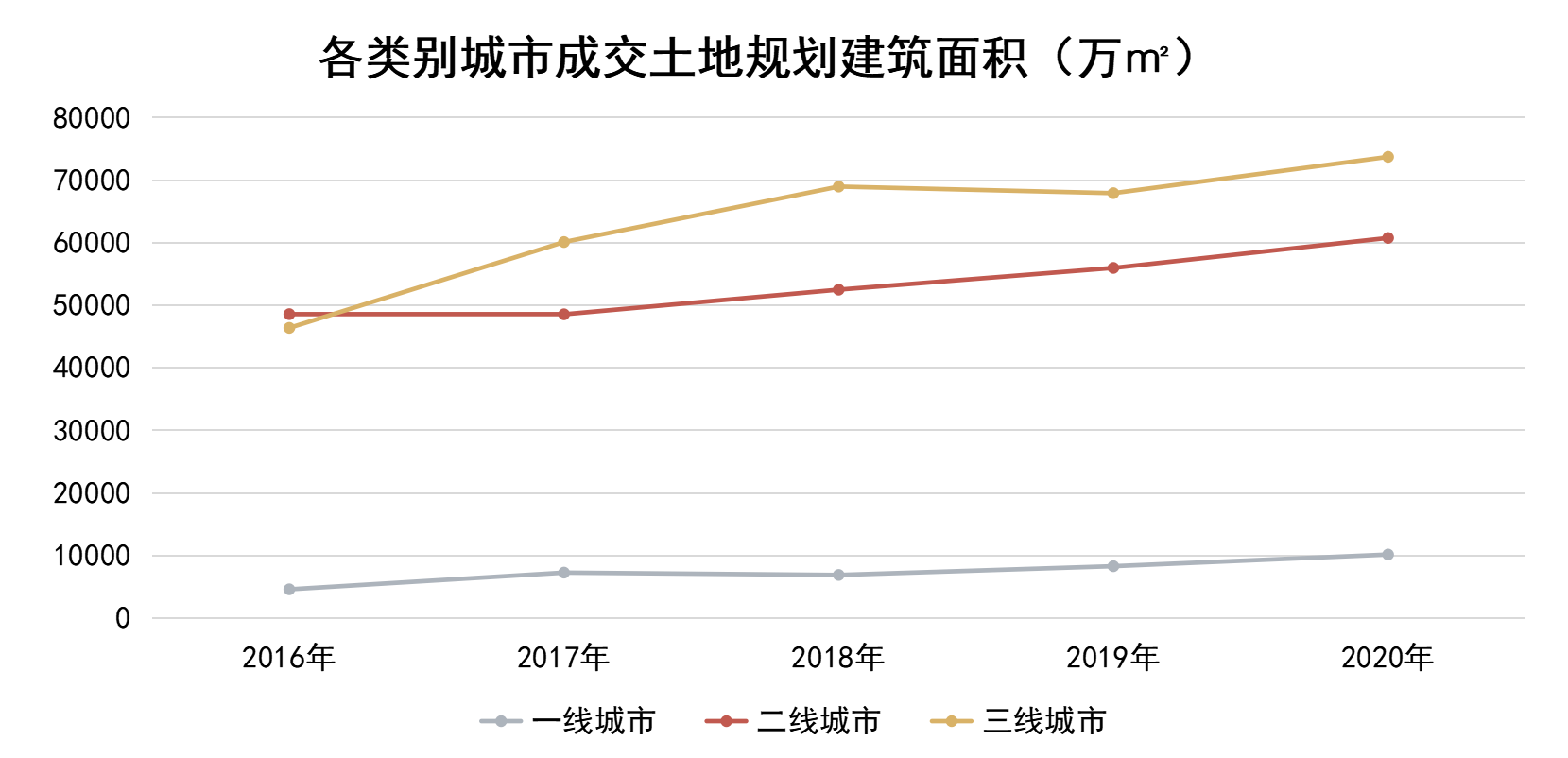 以100個(gè)城市過去5年的土地成交量來看,2020年由于一線及二線城市有大量優(yōu)質(zhì)地塊推出,且溢價(jià)不高,因此占比有所提高或保持高水平,分別為7.02%和42.01%,三線城市占比則略有下降。