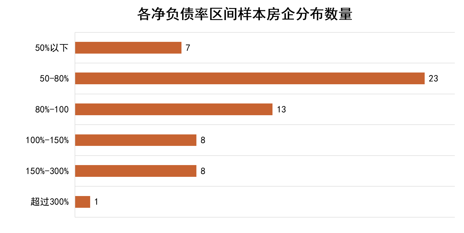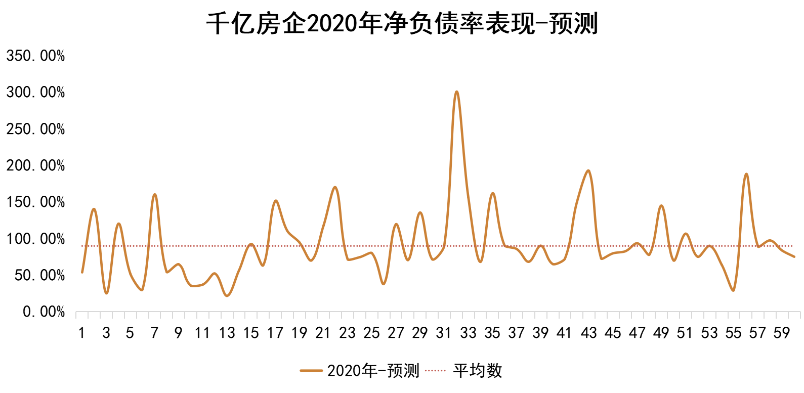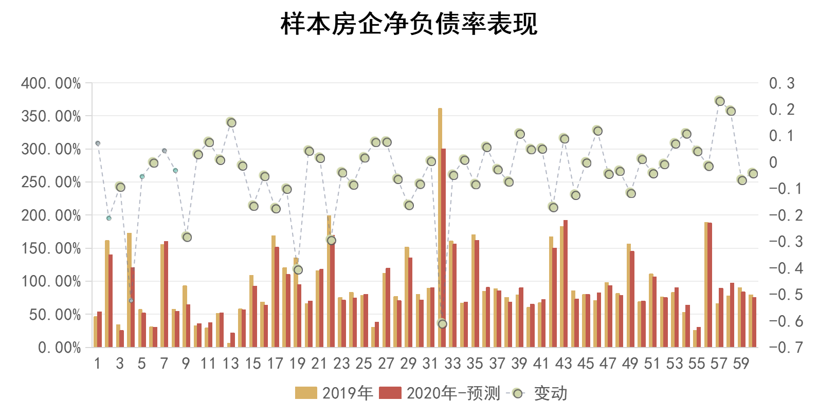 分區(qū)間來看,60家樣本房企中,預(yù)測2020年凈負(fù)債率低于50%的有7家,50%-80%的占比最大,達(dá)到38.33%。要關(guān)注到凈負(fù)債率高于100%,也即踩中一條紅線的有17家,占比28.33%,接近3成。