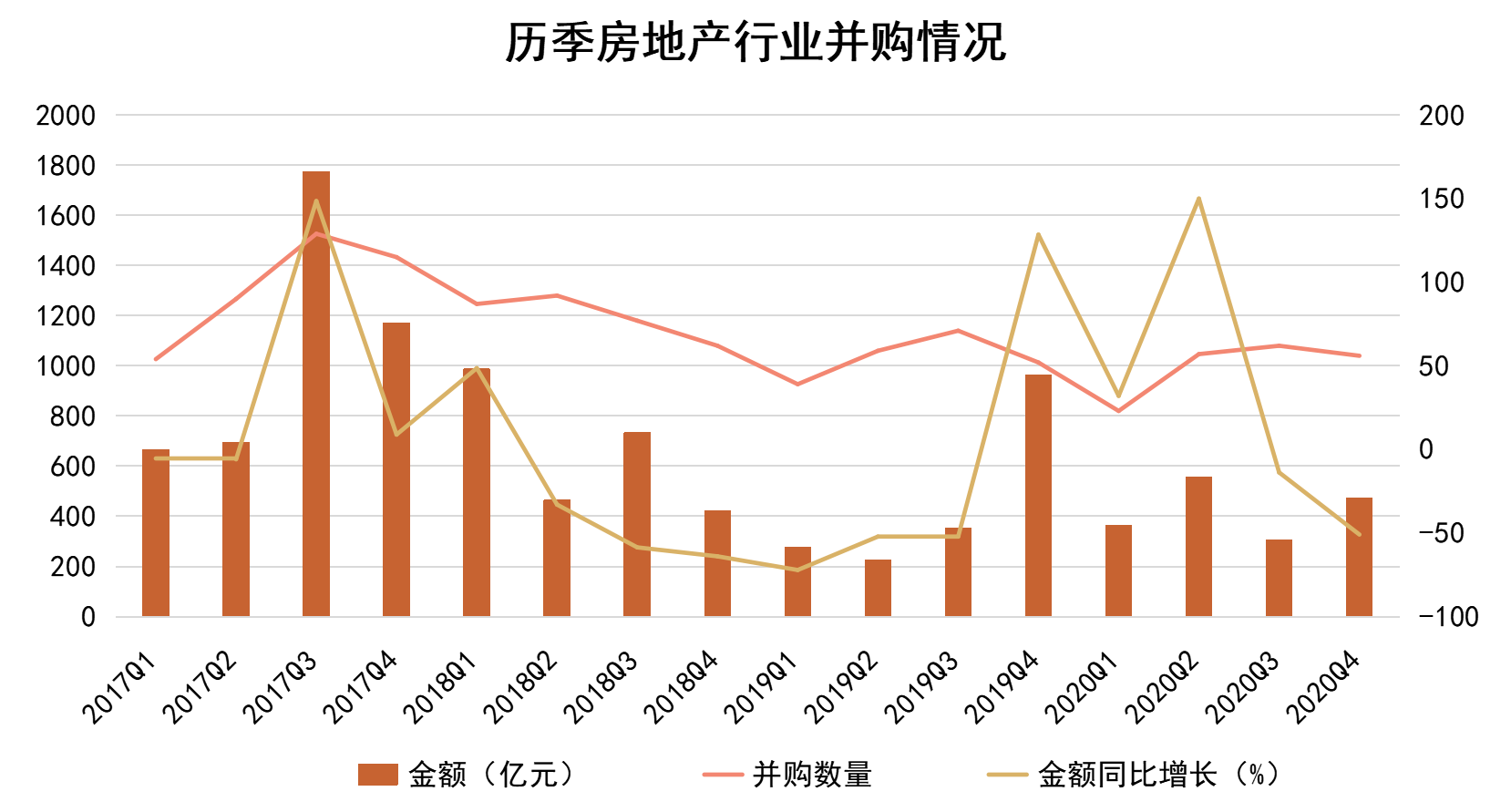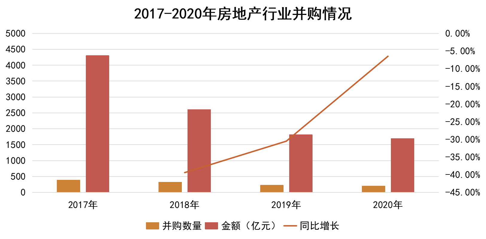 如前文所述,受三道紅線等影響,房企下半年拿地由熱轉(zhuǎn)溫,同時(shí)為“降檔”行業(yè)內(nèi)的并購和資產(chǎn)處置動(dòng)作有所增加。從全行業(yè)看,2020年房地產(chǎn)并購金額為1693.46億元,占所有行業(yè)總和的4.58%。