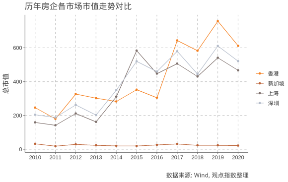 同時(shí)可以發(fā)現(xiàn),內(nèi)地上市房企平均總市值在2015左右出現(xiàn)增長停滯,這也與內(nèi)地股市同期的不佳表現(xiàn)相契合。