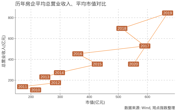 與房企營業(yè)總收入對(duì)比,可發(fā)現(xiàn)平均市值與平均總營業(yè)收入呈現(xiàn)正的相關(guān)性。可以注意到,2020年受到疫情影響,無論是總營業(yè)收入還是市值都出現(xiàn)顯著下挫。
