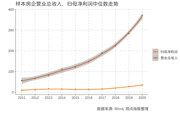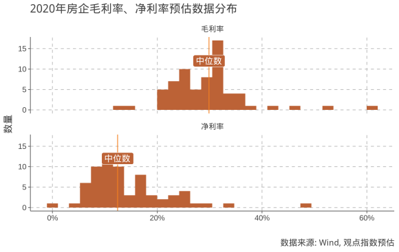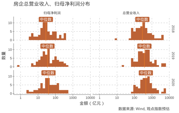 另一方面,觀點(diǎn)指數(shù)預(yù)計(jì)樣本房企歸母凈利潤中位數(shù)在2020年將達(dá)到40億元,同比上漲15.2%,漲幅不及營業(yè)收入;而歸母凈利潤均值為78.9億元,同比上升10.0%。