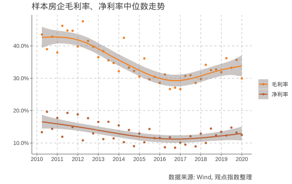 通過觀察歷年72家樣本上市房企毛利率、凈利率中位數(shù)走勢(shì),可以發(fā)現(xiàn)兩者的下行趨勢(shì)。特別在2011、2012年利潤率最高時(shí)期,房企毛利率中位數(shù)可以達(dá)到40%的水平,而2020年基本降至30%以下;同時(shí)可看到,相比于凈利率,毛利率波動(dòng)性更為明顯。