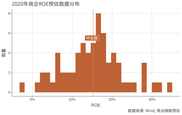根據(jù)觀點(diǎn)指數(shù)預(yù)估,樣本房企2020年凈資產(chǎn)收益率(ROE)平均約為15.5%,中位數(shù)15.0%。
