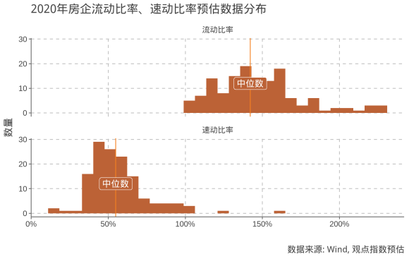 觀點(diǎn)指數(shù)預(yù)計(jì),樣本房企2020年末流動(dòng)比率水平與2019年年末基本持平,中位數(shù)大約1.42,小幅低于2019年中位數(shù)1.44;而速動(dòng)比率約為0.55,略優(yōu)于2019年的0.52。