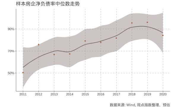 與流動(dòng)性趨勢(shì)相對(duì)應(yīng)的是負(fù)債的增長,根據(jù)樣本房企過去10年凈負(fù)債率中位數(shù)走勢(shì),行業(yè)平均負(fù)債水平已從2010年的47.8%上升到2019年末的79.7%。