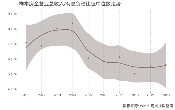 觀點(diǎn)指數(shù)預(yù)計(jì),隨著監(jiān)管加強(qiáng)及自身意識(shí)提高,房企整體收入對(duì)負(fù)債的覆蓋程度會(huì)有所提高。