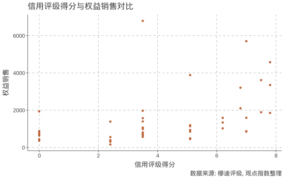 觀點指數根據穆迪評級機構對上市房企的信用評級(指發(fā)行人評級或企業(yè)家族評級)進行打分,并將其房企的權益銷售進行對比,可發(fā)現(xiàn)統(tǒng)計顯現(xiàn)出顯著的相關關系:Spearman相關系數為0.70,p值接近0,意味著該相關性通過顯著性檢驗。