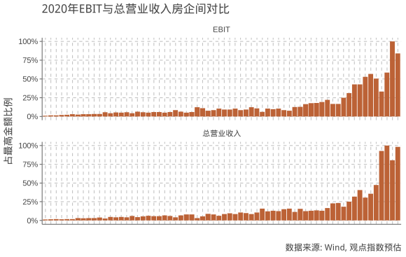 此外,觀點(diǎn)指數(shù)還預(yù)計(jì)個(gè)別房企EBIT水平在2020年會(huì)超過1000億元。為更好顯示分布情況,下圖橫軸坐標(biāo)進(jìn)行了對(duì)數(shù)變換。