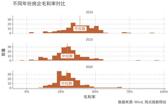 根據(jù)歷年樣本房企毛利情況可發(fā)現(xiàn),2010年左右房地產(chǎn)行業(yè)毛利率整體較高,而且利潤(rùn)水平相對(duì)較為分散。隨著房地產(chǎn)行業(yè)發(fā)展的成熟,毛利率分布更加集中。