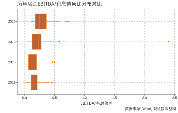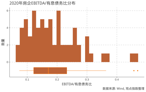 此外,觀點(diǎn)指數(shù)預(yù)計(jì)2020年樣本房企EBITDA/有息債務(wù)比值的中位數(shù)為0.16。但同時(shí),約75%的樣本房企該指標(biāo)將高于0.12,同時(shí)也不會(huì)有房企超過(guò)0.50。
