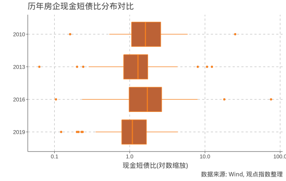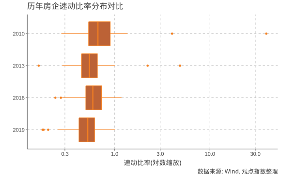無(wú)法償債最直接的原因便是流動(dòng)性不足,根據(jù)樣本房企歷年的財(cái)務(wù)情況來(lái)看,速動(dòng)比率中位數(shù)變化不大,但可發(fā)現(xiàn)指標(biāo)分布上從右傾變?yōu)樽髢A,即從部分房企流動(dòng)十分充足演變至部分房企流動(dòng)性吃緊,反映了這些房企在運(yùn)營(yíng)中較為激進(jìn)的策略。