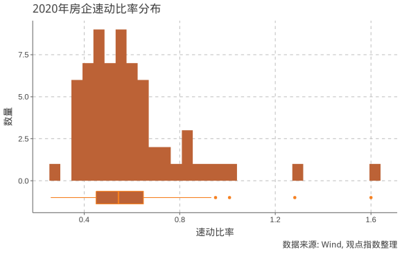 觀點(diǎn)指數(shù)預(yù)計(jì),樣本房企2020年速動(dòng)比率中位數(shù)為0.54,略高于2019年的0.52。同時(shí),約有半數(shù)樣本房企的速動(dòng)比率在0.45至0.64之間。