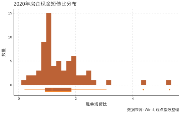 觀點(diǎn)指數(shù)預(yù)計(jì),75%的樣本房企現(xiàn)金短債比水平會(huì)高于0.92,而中位數(shù)為1.16,較2019年均有改善。這意味著超過(guò)半數(shù)的樣本房企達(dá)到了“三道紅線”的要求,而即便沒(méi)有達(dá)到“三道紅線”的標(biāo)準(zhǔn),大部分樣本房企的負(fù)債情況也不會(huì)有顯著的償債壓力。