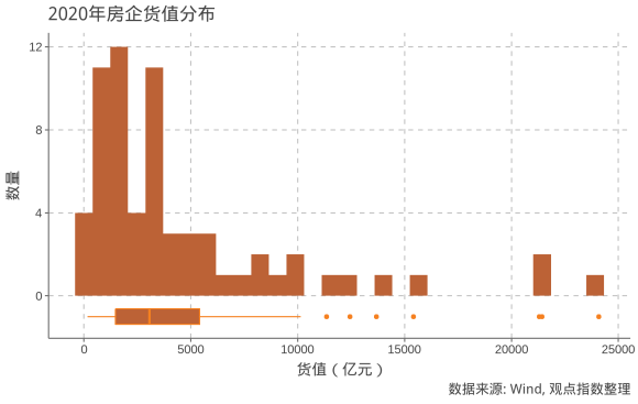 根據(jù)觀點(diǎn)指數(shù)統(tǒng)計(jì)整理,樣本房企截至2020年年末平均貨值為4599.7億元,中位數(shù)為3063.8億元。